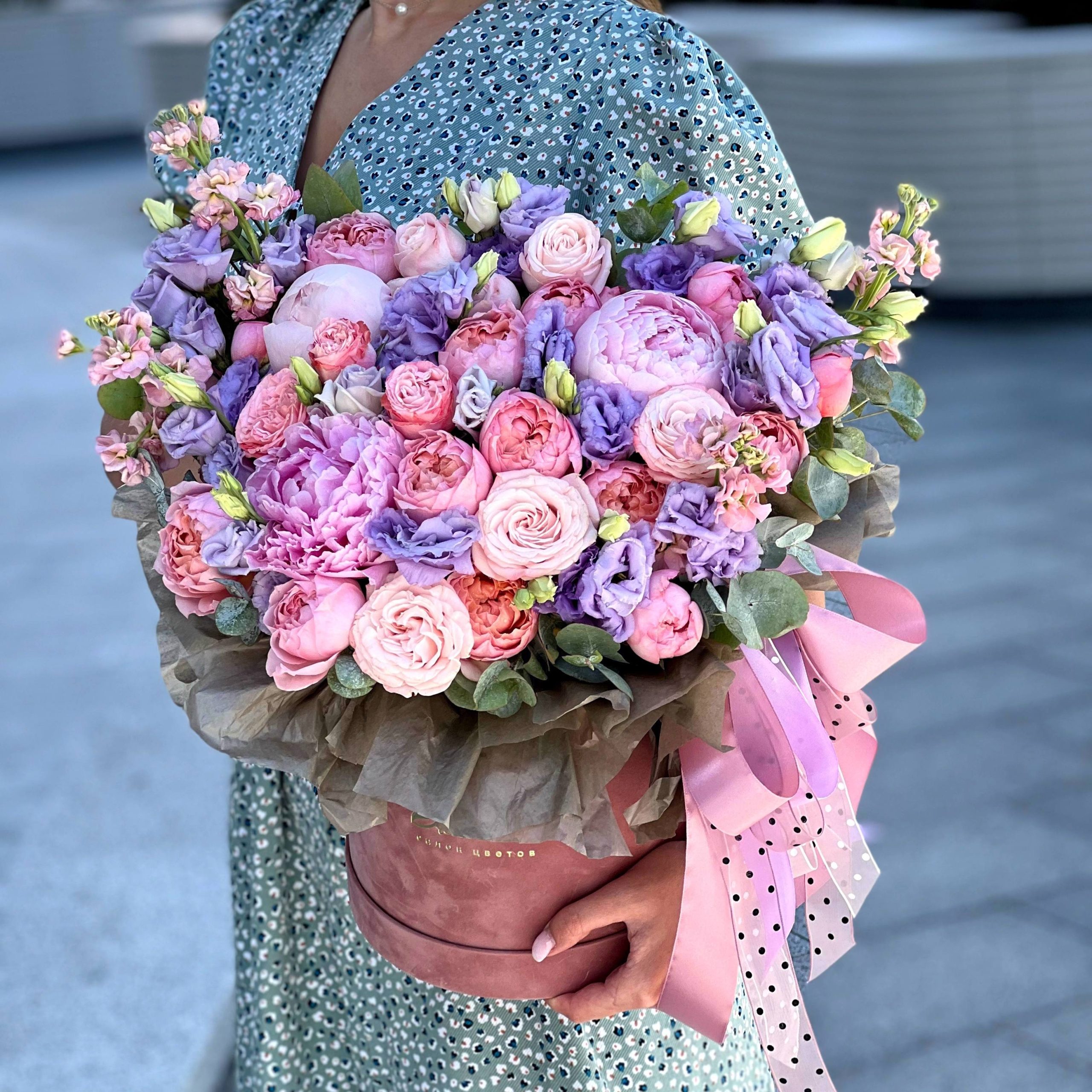Бархатный цилиндр из пионовидных роз, маттиол и эустомы в Сортавале